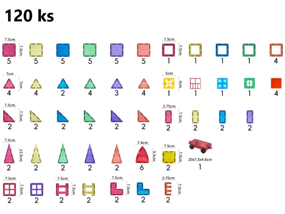 - Rozměry dílků: čtverec, 7,5 x 7,5 cm, trojúhelník rovnostranný 7 x 7 cm, trojúhelník pravoúhlý 7,5 x 7,5 cm, trojúhelník vysoký 13,5 x 7,5 cm, podvozek 4,6 x 20 x 7,5 cm (rozměry najdete v galerii fotografií).